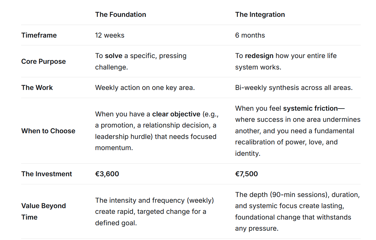 This engagement is designed for leaders whose challenges are not confined to one area of life — where career, relationships, ambition, and identity influence each other over time.